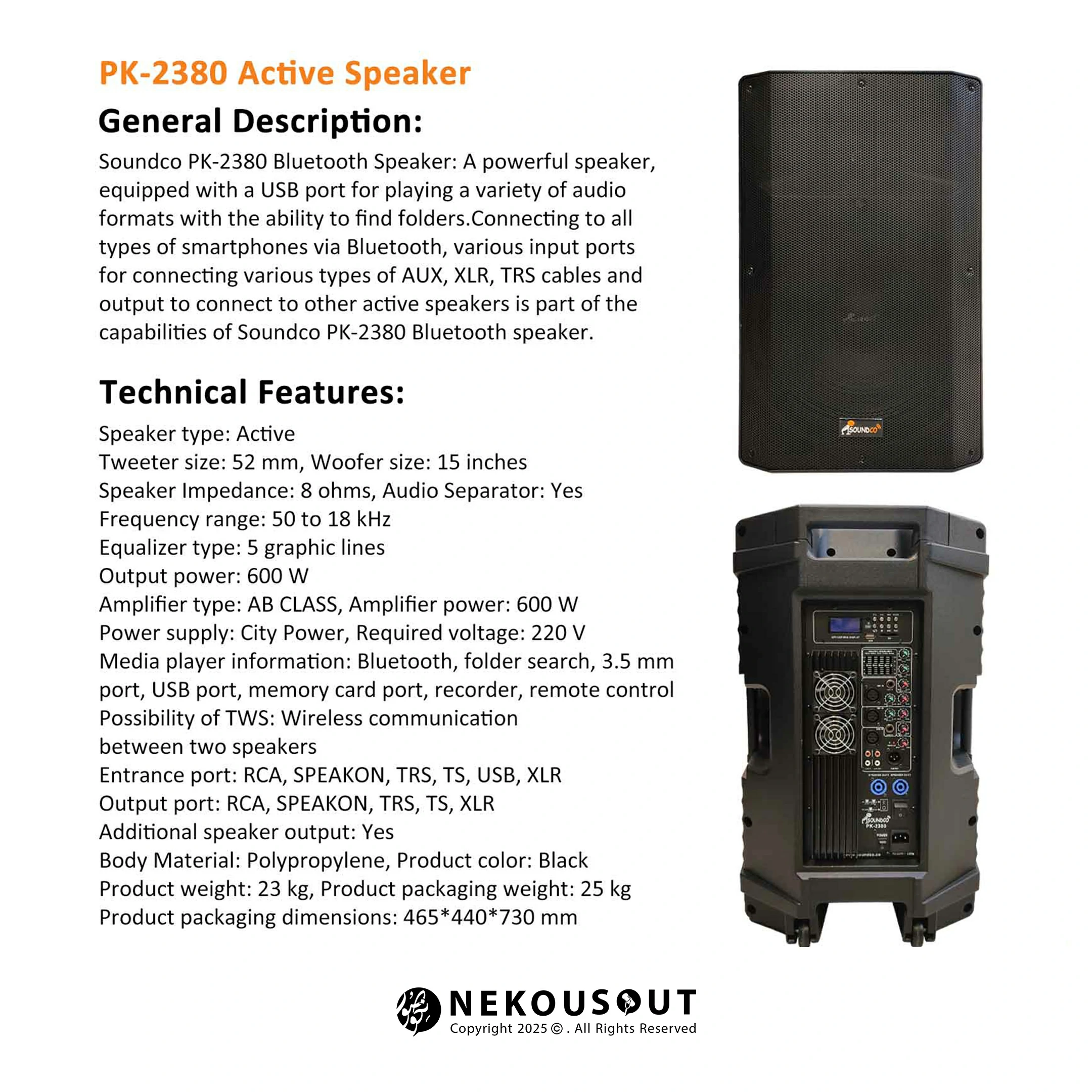باند اکتیو ساندکو Soundco PK-2380 یک اسپیکر قدرتمند و واکنش‌گرا با طراحی چندمنظوره است که با رنگ مشکی و ابعاد مناسب، تعادل خوبی میان حمل‌پذیری و زیبایی ایجاد کرده است. وزن حدود ۲۵ کیلوگرم آن باعث شده جابه‌جایی در موقعیت‌های متنوع عملی باشد و در عین حال حس حرفه‌ای بودن را القا کند. این باند به دلیل ظاهر شکیل و استایل مدرن، با فضاهای مختلف هماهنگ می‌شود و می‌تواند هم در محیط‌های رسمی و هم در دورهمی‌های غیررسمی مورد استفاده قرار گیرد.