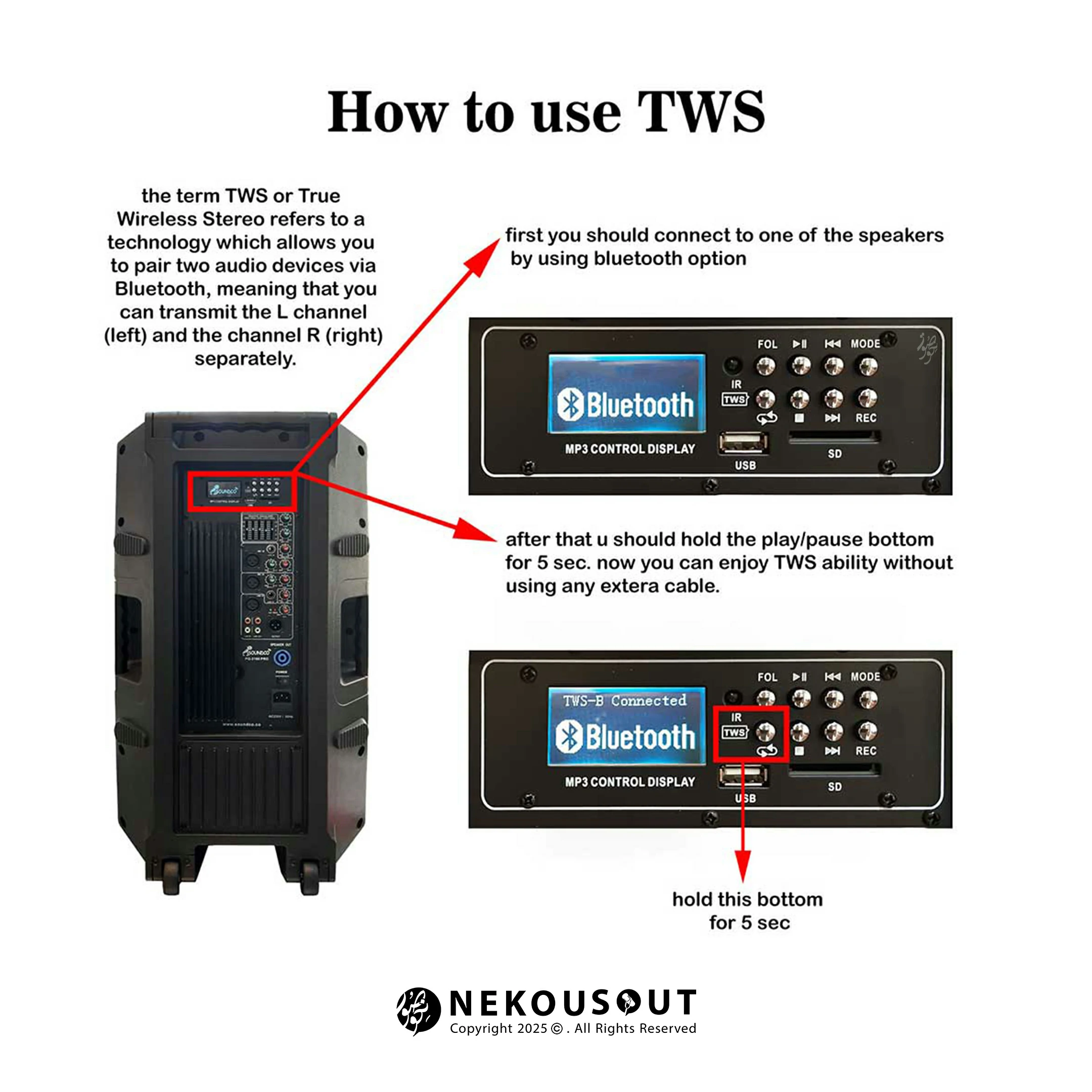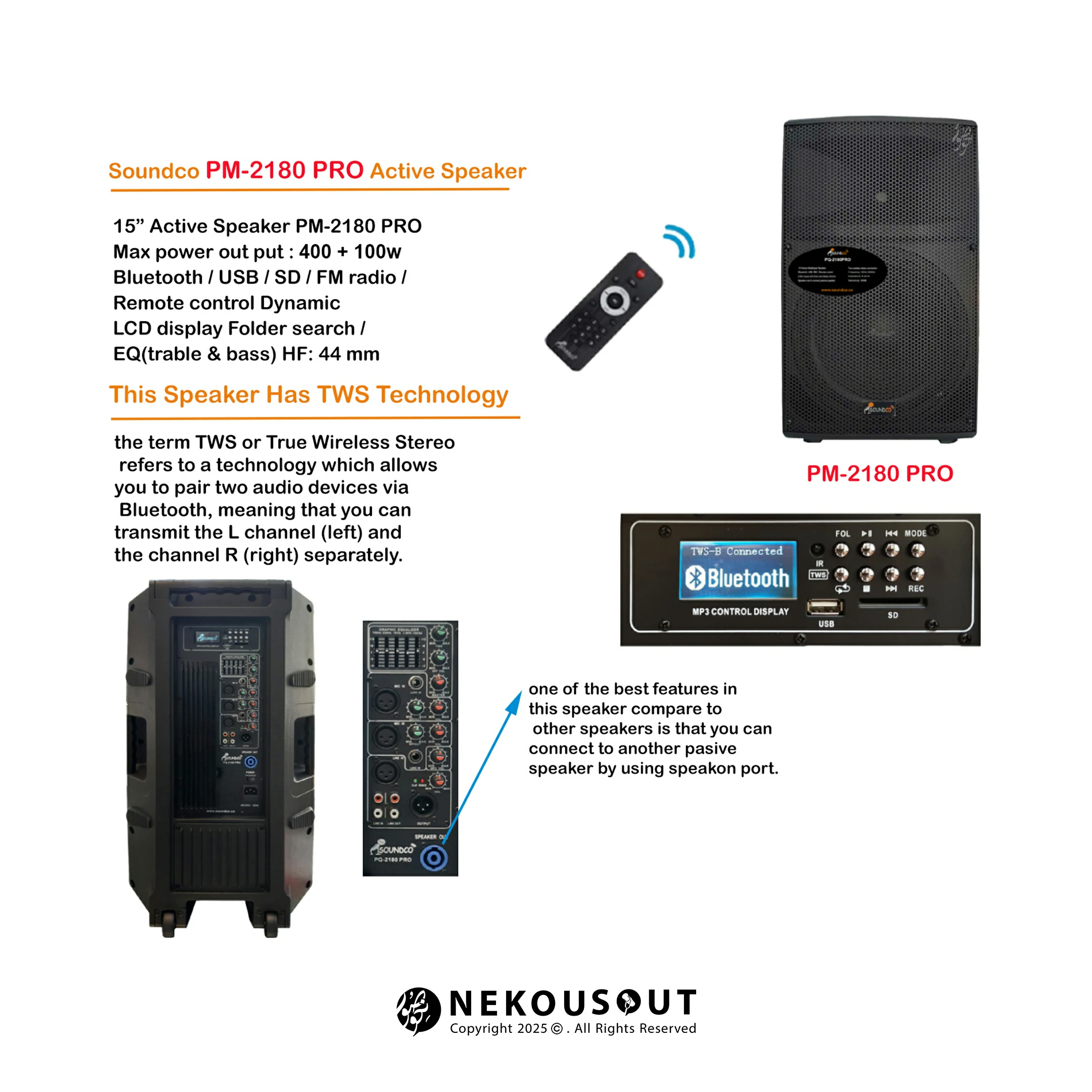 این اسپیکر مجهز به ووفر ۱۵ اینچی و تیوتر ۴۴ میلیمتری است که توان خروجی ۴۰۰+۱۰۰ وات را ارائه میدهد. تکنولوژی TWS در این مدل امکان اتصال بیسیم دو اسپیکر را فراهم کرده و تجربه صدایی فراگیر را رقم میزند. اکولایزر با ۵ ولوم کشویی، قابلیت اکو و تکرار با کنترل مجزا، و امکان ضبط صدا از طریق USB نیز در این مدل وجود دارد. درگاههای ارتباطی شامل USB، SD، بلوتوث، RCA، XLR و اسپیکون است که تنوع اتصال را برای کاربر سادهتر کردهاند.