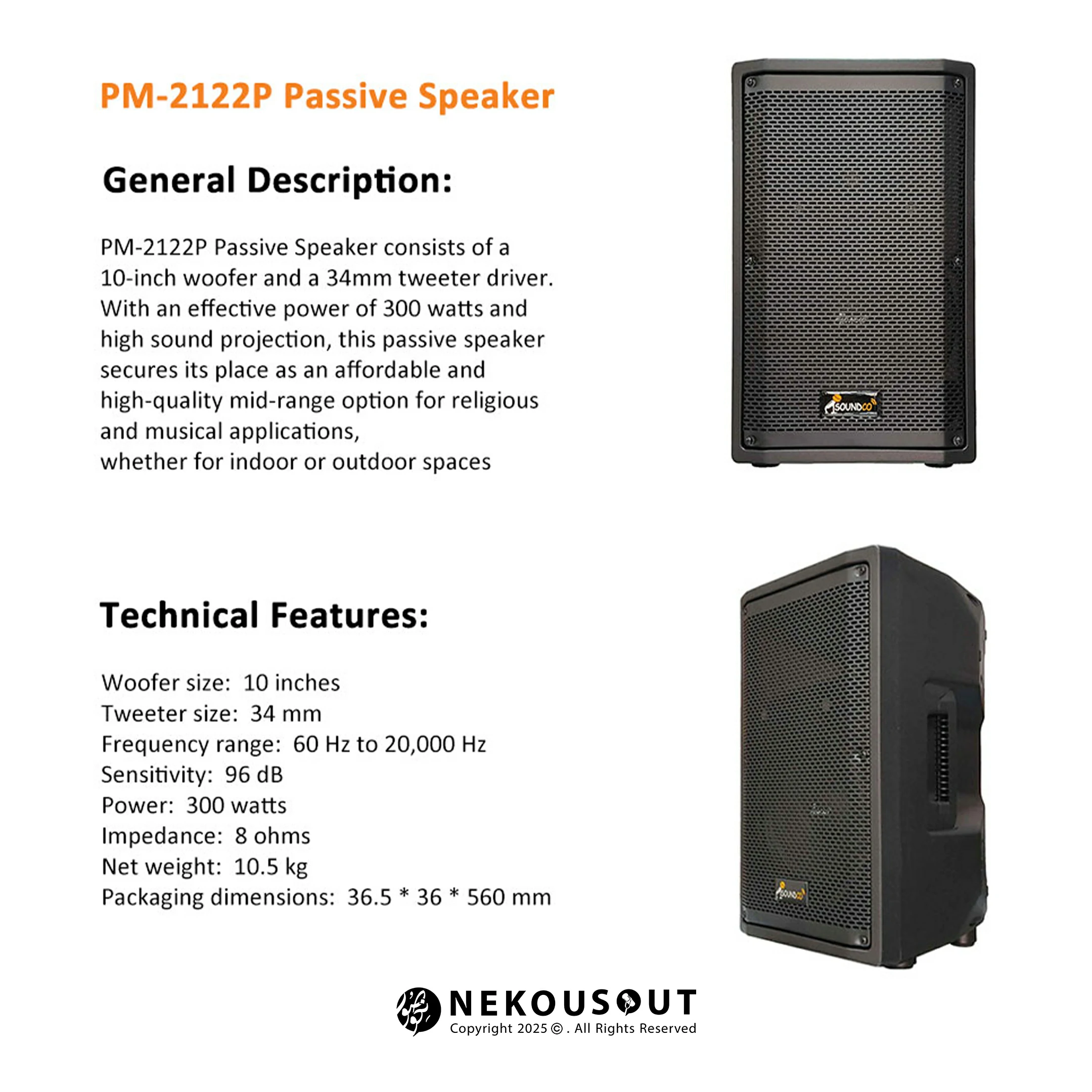 ووفر 10 اینچی این مدل، بیس قدرتمندی تولید می‌کند که برای فضاهای متوسط ایده‌آل است. تیوتر 34 میلی‌متری صدایی شفاف و دقیق در فرکانس‌های بالا ارائه می‌دهد. توان 300 وات امکان استفاده در رویدادهای مختلف را بدون افت کیفیت فراهم می‌کند. دامنه فرکانسی 60 تا 20000 هرتز پوشش صدایی کامل از فرکانس‌های پایین تا بالا ایجاد می‌کند. حساسیت 96 دسی‌بل باعث می‌شود حتی با توان کمتر نیز صدایی بلند و واضح داشته باشید. امپدانس 8 اهم به شما امکان اتصال دو بلندگو به هر کانال پاور میکسر را می‌دهد. وزن 10.5 کیلوگرمی حمل و نصب را ساده کرده و ابعاد 36.5 در 36 در 56 سانتی‌متر امکان استفاده در فضاهای محدود را فراهم می‌کند.