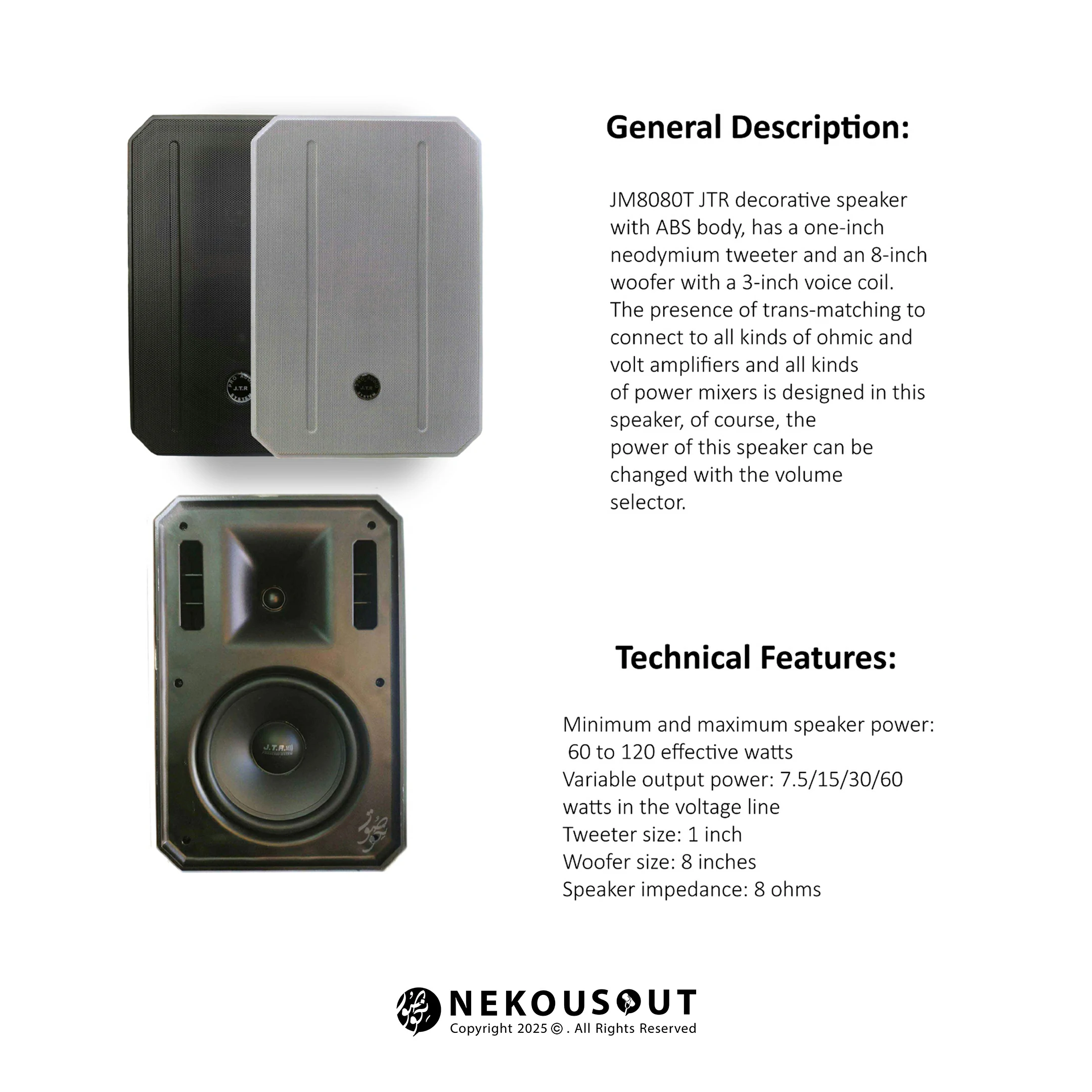 بلندگو JTR JM8080T با تیوتر یک اینچی نئودیوم و ووفر ۸ اینچی همراه با وویس کویل ۳ اینچی، صدایی شفاف و پرقدرت ایجاد می‌کند. وجود برد کراس‌اور، تفکیک دقیق صدا را ممکن کرده و ترانس مچینگ داخلی امکان اتصال به آمپلی‌فایرهای اهمی و ولتی را فراهم می‌سازد. توان متغیر خروجی در حالت ولتی بین 7.5، 15، 30 و 60 وات قابل انتخاب است، در حالی که توان واقعی آن بین 60 تا 120 وات مؤثر متغیر می‌باشد.