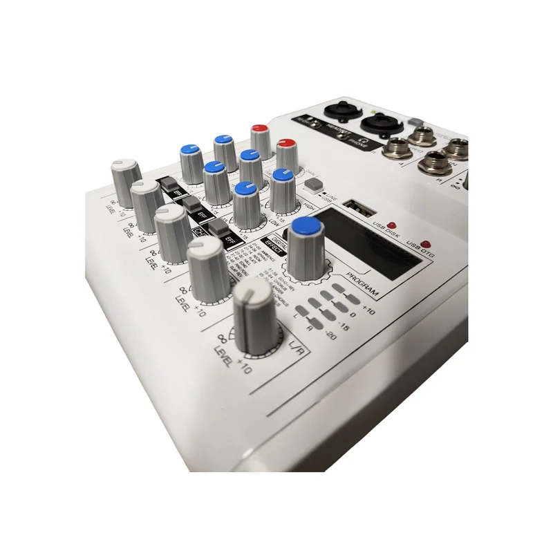 • ۴ ورودی حرفه‌ای و متنوع: این میکسر شامل ۲ ورودی میکروفون کمبو (XLR-TRS) و ۲ ورودی بنون (TRS) است که تنوع بالایی برای اتصال تجهیزات مختلف صوتی ارائه می‌دهد.